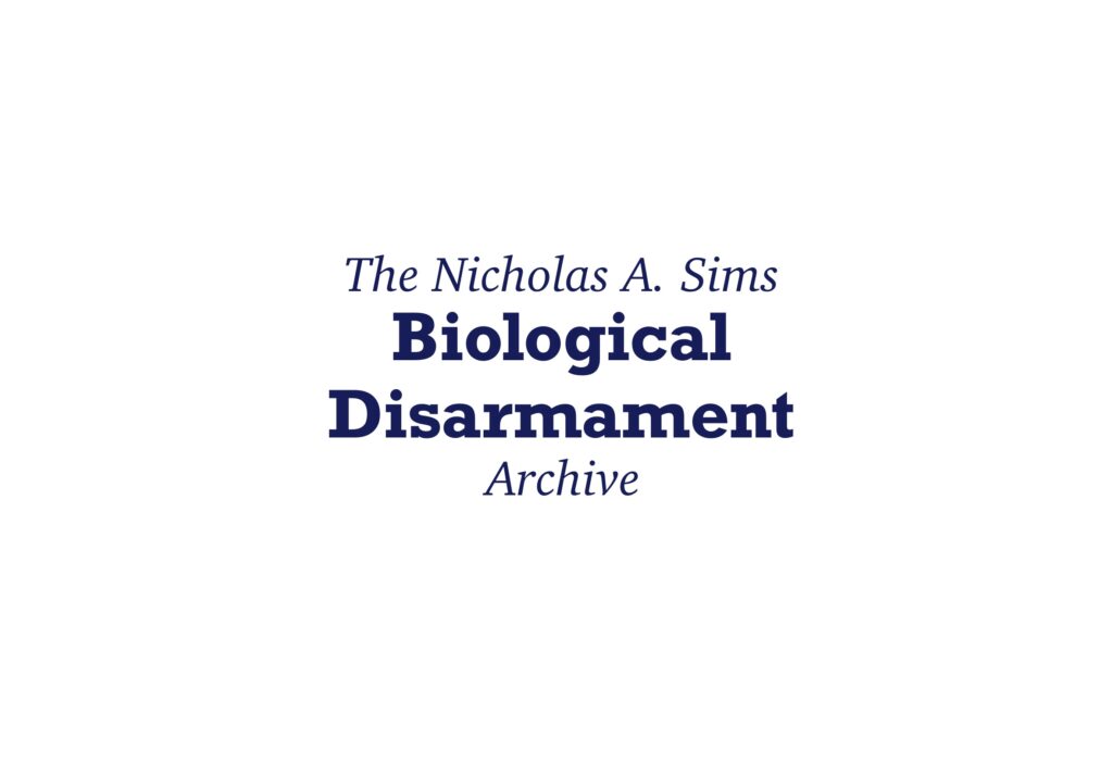 This archive, which I established and curate, encompasses Nicholas A Sims’ unique collection of documents spanning 50 years of multilateral negotiations on biological weapons. A public archive housed in the Department of War Studies at King’s, it is a distinctive resource for students, educators and practitioners. The archive was inaugurated by the UK Disarmament Ambassador to the UN, David Riley, at a launch event in May 2025 and is now being further developed as a teaching and research asset.